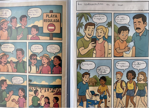 Dans le cadre du cours d’espagnol, les élèves de Terminale professionnelle AGORA ont réalisé par groupes des planches de bande dessinée pour sensibiliser au tourisme de masse. À travers des situations variées, ils mettent en lumière les conséquences de ce