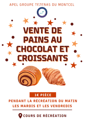 A partir du mardi 6 janvier l’APEL va organiser des ventes de pains au chocolat et croissants. Elles se dérouleront les mardis et vendredis lors des récréations du matin (9h30-10h00).