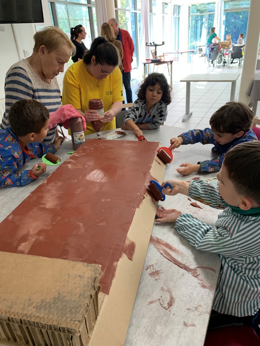 Avec les résidents de la maison de retraite Lamartine, les Grandes Sections réalisent les décors pour leur projet autour du conte, le loup, la chèvre et les